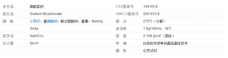 碳酸氢钠(NaHCO₃)(Sodium Bicarbonate),俗称小苏打。白色细小晶体,在水中的溶解度小于碳酸钠。它也是一种工业用化学品,固体50℃以上开始逐渐分解生成碳酸钠、二氧化碳和水,270℃时完全分解。碳酸氢钠是强碱与弱酸中和后生成的酸式盐,溶于水时呈现弱碱性。此特性可使其作为食品制作过程中的膨松剂。碳酸氢钠在作用后会残留碳酸钠,使用过多会使成品有碱味。